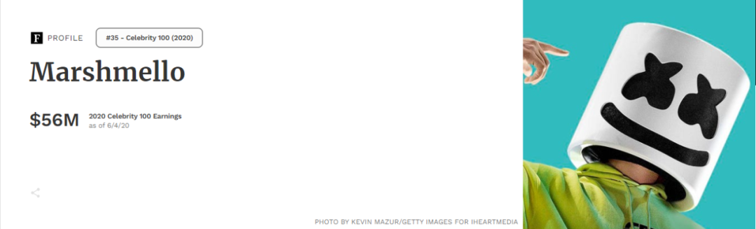 Marshmello在2020年的福布斯100名人榜中位列第35名;图片来源:福布斯官网截图
