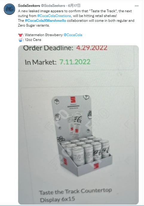 此外,在推特上也有一个经常追踪饮料新品的账号SodaSeekers发布了相关信息,表示合作新品的产品图已被提前透露,产品规格为12oz。