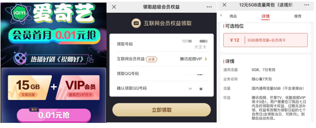 与运营商捆绑包括短信、公众号与APP的页面推荐、手机卡套餐的附赠权益和定向流量套餐等方式,推销的视频平台产品包括日卡、周卡、月卡、季卡和年卡。例如移动最近的0.01元抢购爱奇艺VIP月卡,12元5G流量周包赠送VIP周卡,电信大王卡赠送腾讯视频VIP会员卡。