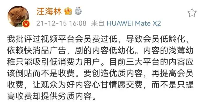爱奇艺去年12月宣布涨价后迅速成为热搜第一,评论主要是吐槽,包括内容差、广告多、价格贵、涨价不增加服务和吃相难看等。爱奇艺这次热搜之旅,可以说是被骂上的。中消协也曾表示视频平台要尊重广大消费者。