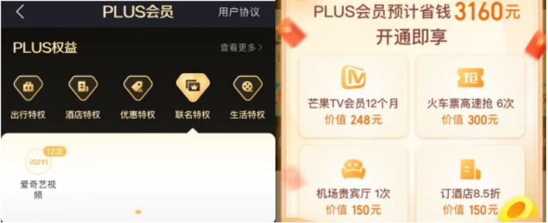 赠送会员最知名的是淘宝88VIP,淘气值1000以上淘宝用户88元开通服务,并赠送优酷视频年卡。去哪儿网的plus会员与之类似,之前赠送爱奇艺会员,现在赠送芒果TV会员,都是12次月卡,分月领取,售价是新会员88元,老会员68元。淘宝和去哪儿分别是网购、交通领域使用最广泛的APP,这种包年费用不超过百元,还赠送定价超过200元的视频会员年卡,自然具有很强的吸引力。