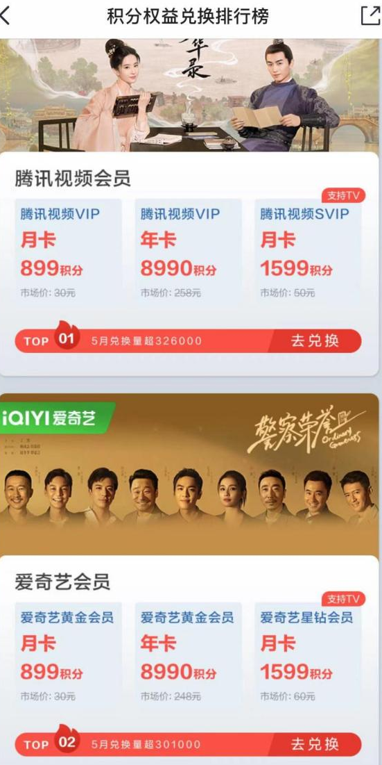 前者有机票里程和信用卡积分。目前,国航5600里程可兑换爱奇艺或者腾讯视频会员月卡,11000里程兑换半年卡,招行信用卡899积分可兑换腾讯视频或者爱奇艺VIP月卡,8990积分兑换年卡。支付宝积分则以优惠券为主,兑换的平台最多,除了优爱腾还有芒果TV和哔哩哔哩。如果是支付宝钻石会员,则每月可以免费领取一张优酷或芒果TV月卡。