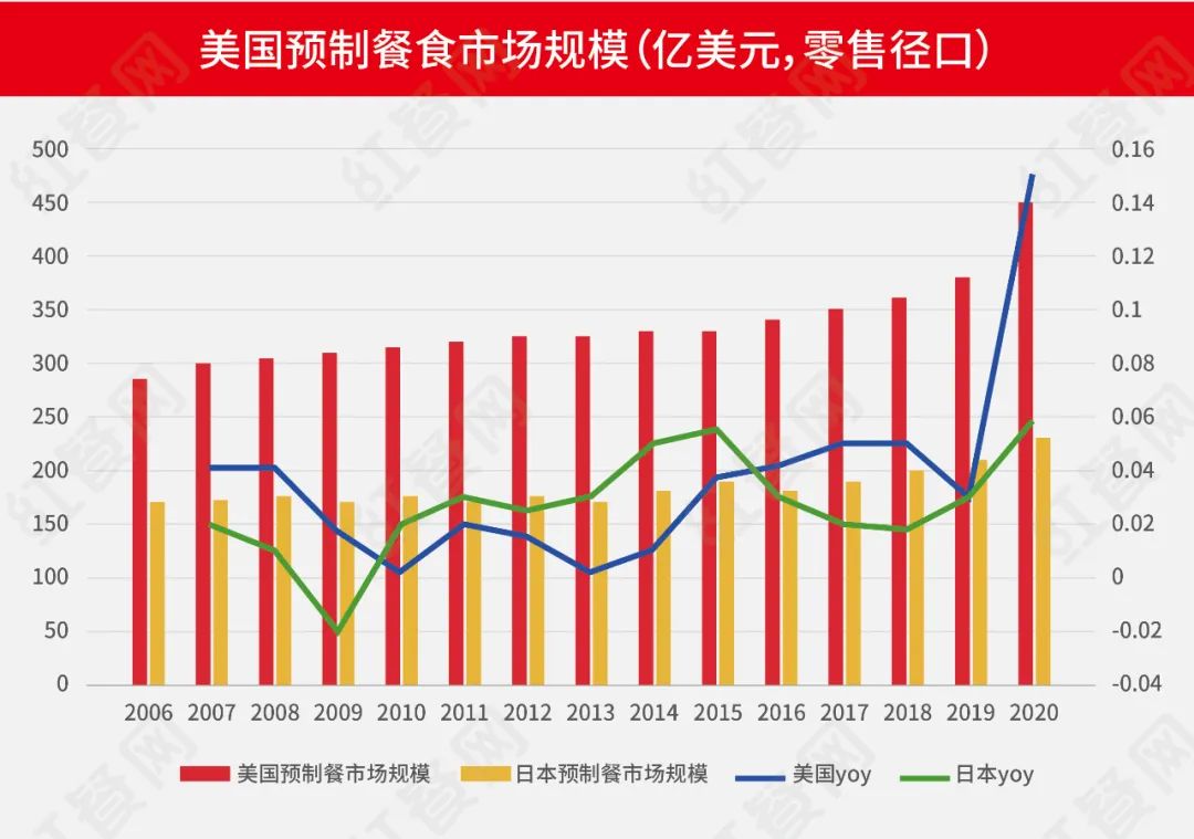 根据欧睿国际数据,2020年美国预制菜市场规模为454亿美元,日本预制菜市场规模为238.5亿美元。