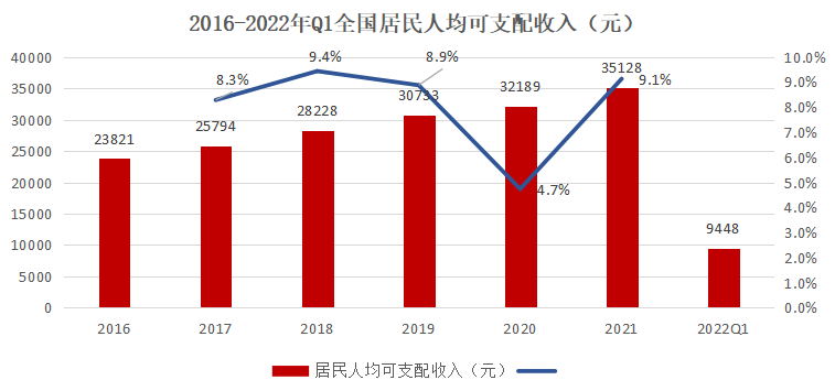 从2016年以来,我国人均可支配收入持续增长,除了2020年受疫情影响,增长的步伐有所放缓,其他年份均保持8%以上的增速。