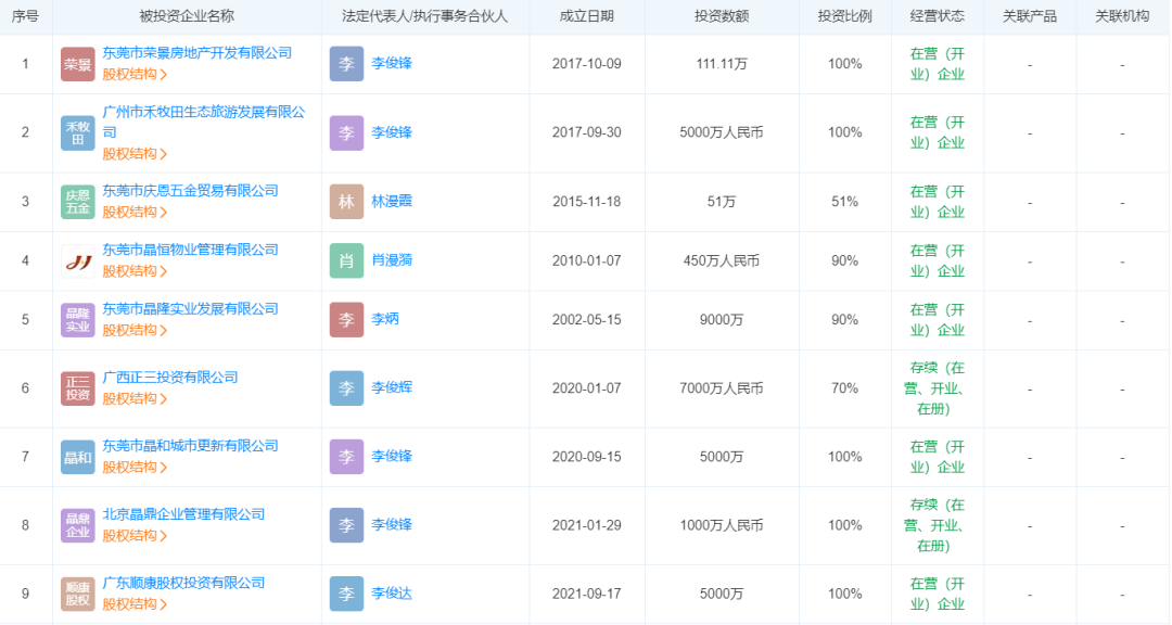 通过天眼查发现,晶腾达的法人李俊锋与晶和实业集团有限公司(以下简称“晶和集团”)有着千丝万缕的联系。晶和集团投资的多家企业中,密集出现了李俊锋和李俊达的名字,而这二人,也是晶腾达控股股东东莞市信达智和企业管理有限公司的两位股东。