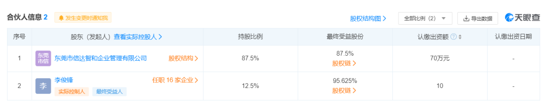 其次,作为目标公司,晶腾达是一家非常新的公司。天眼查显示,东莞市晶腾达企业管理合伙企业(有限合伙)注册成立于2021年8月26日,法人李俊锋。李俊锋和其绝对控股的东莞市信达智和企业管理有限公司,认缴出资额合计只有80万元。成立不到1年、认缴出资额不足百万,却要参与6.87亿元的定增。李俊锋及其公司是否有足够的实力,背后是否有其他资方,无法明确。