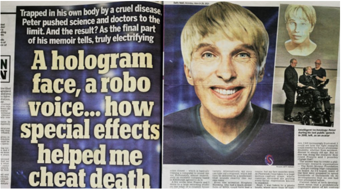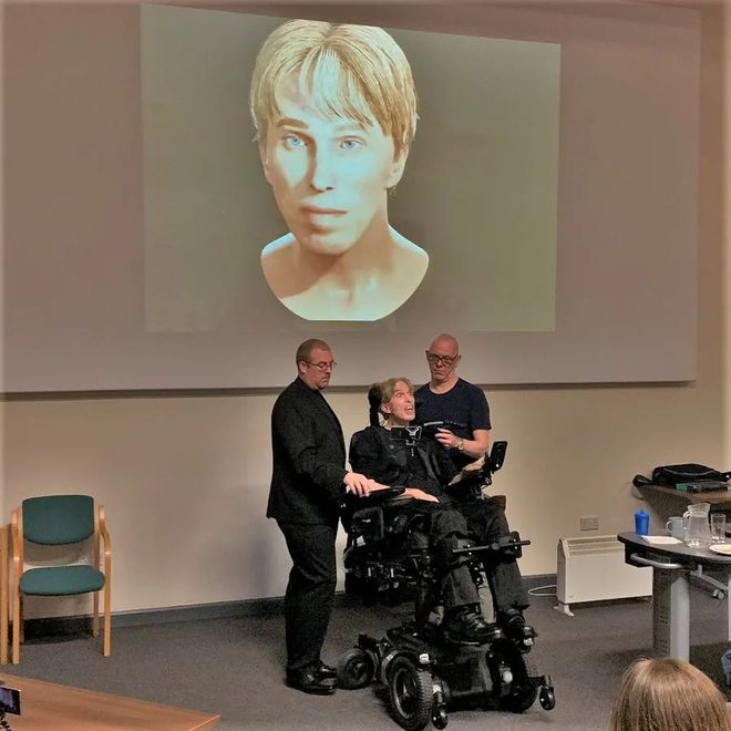 考虑到渐冻症会让彼得,逐渐丧失面部表情。他也提前联系了 Embody Digital 公司进行面部动作捕捉,制作一个生动逼真的3D虚拟形象。