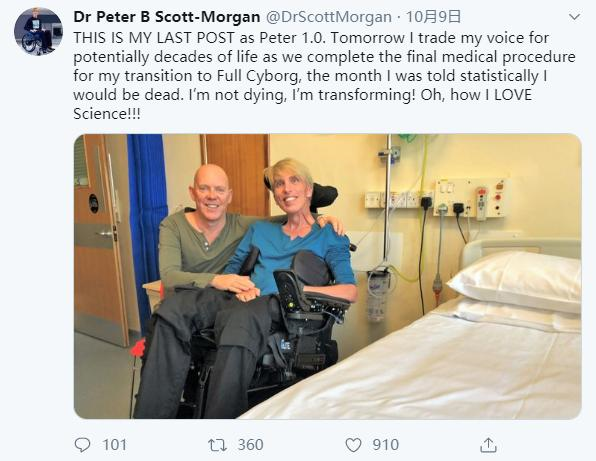 “这是我作为彼得1.0的最后一篇文章。明天,我将完成最终的医疗程序以完成向半机械人的过渡,我的声音可能还会持续数十年。从统计学上来看,本来这个月我便会死去。我还没有死,我正在改变。我热爱科学。”