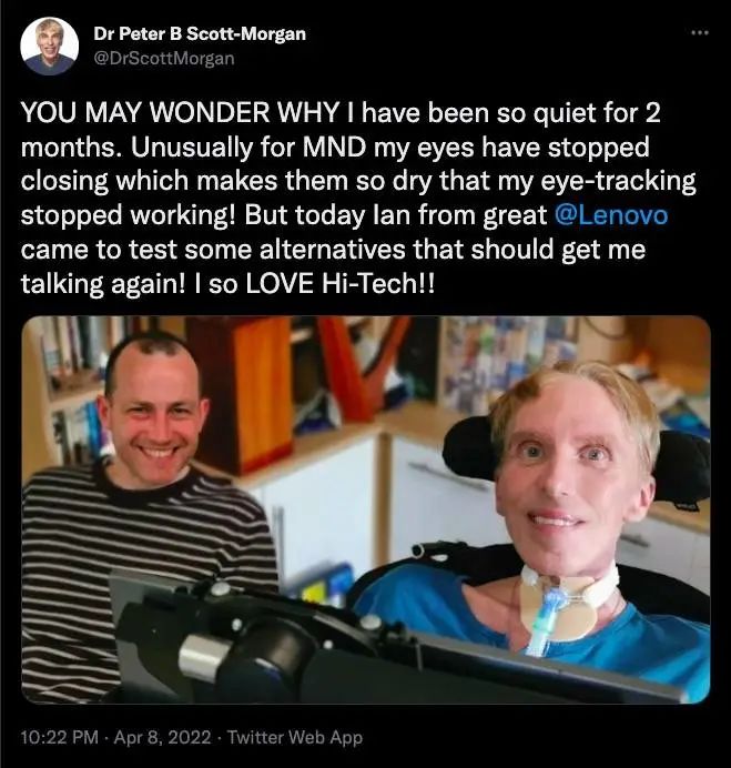 2022年4月,彼得在推特上表示,渐冻症已经导致他的双眼难以闭合,因为眼睛干涩,无法使用眼动追踪来跟大家沟通。