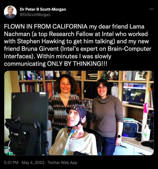 5月,英特尔的脑机专家探望彼得,让他体验脑机接口设备,尝试进行意念沟通。