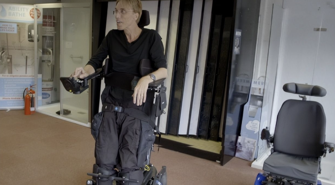 彼得的轮椅,看起来就像一个灵活的工作站。上面安装了机械臂、摄像头、笔记本电脑等设备,还可以帮助他“直立行走”。
