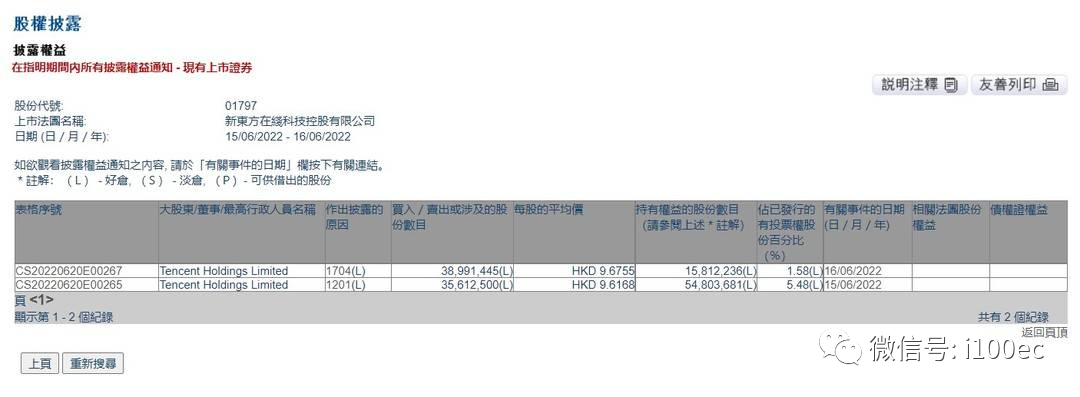 据港交所披露,在6月15-16日两天内,作为新东方在线第二大股东、持股超6年的腾讯控股总计卖出7460.39万股,卖出均价约为9.6港元,共计套现7.19亿港元,减持后腾讯控股的持股比例从9.04%骤降至1.58%。