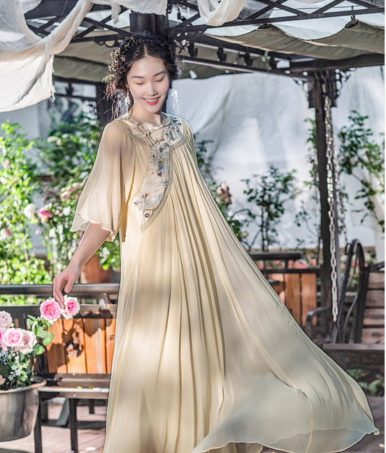 在此影响下,新中式服饰迅速破圈。大学毕业后踏入职场还不满一年的陈茵一边追剧,一边也给自己买了三件中国风连衣裙,平时经常穿职业装的她,将新中式风格的衣服视为新宠,聚会或者外出游玩,时常会穿,并且,“拍照很美”。
