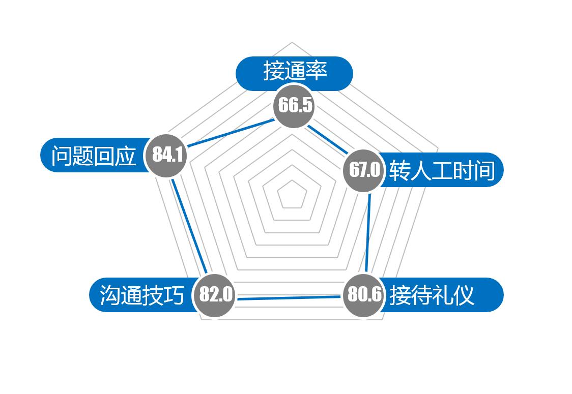 从2016年12345热线各指标得分情况来看,热线总体接通情况仍不尽如人意,接通率及转人工时间总体得分较低;热线总体服务水平相对而言较高,在问题回应、沟通技巧、接待礼仪几个指标上评价均达到优秀水平。