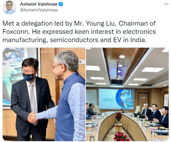 印度铁道、通信以及电子和信息技术部长阿什维尼·瓦伊什瑙(Ashwini Vaishnaw)6月23日在推特发文称:“会见了由鸿海董事长刘扬伟先生率领的代表团。他表示对印度的电子制造、半导体和电动汽车非常感兴趣。”