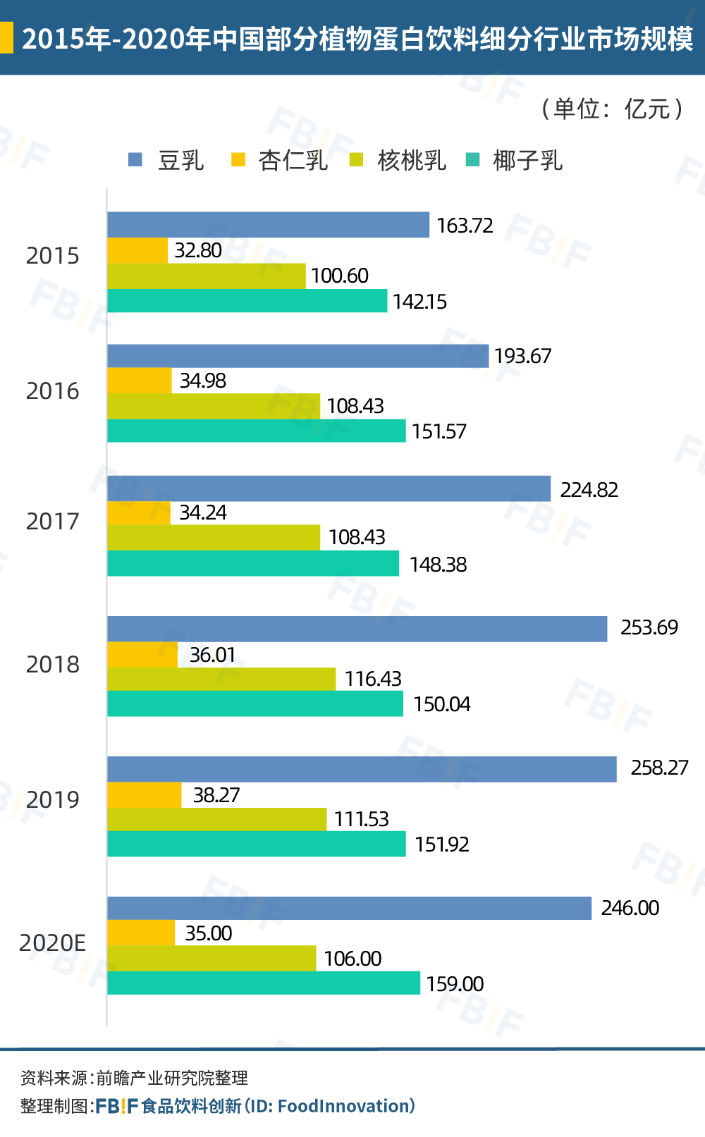 2015-2020年中国部分植物蛋白饮料细分行业市场规模;图片来源:FBIF