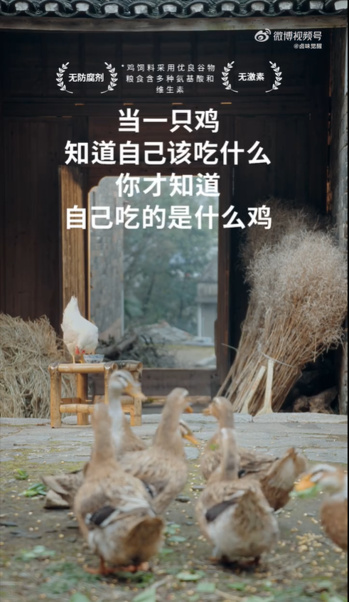 今年3月,卤味觉醒发布了首支品牌片《一只更好的鸡,一块更好的肉》,整部广告片让鸡成为主角,用正经又黑色幽默的风格,展示出鸡的养殖过程。