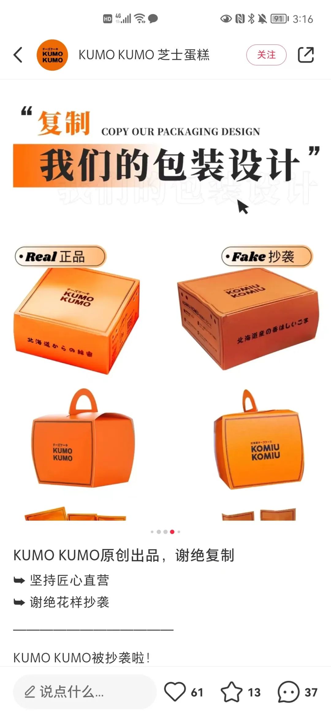 与此同时,一些仿照品牌也随之出现,相似的橙色包装、一字之差的品牌名,消费者若不仔细辨别就难以发觉区别,以至于KUMOKUMO品牌官博专门发布“谢绝复制”的帖子,足以见这款重生的芝士蛋糕的火爆程度。