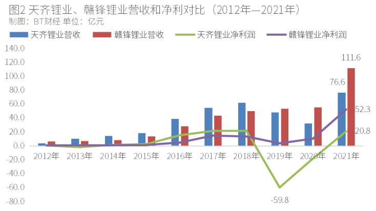 从2019年起,赣锋锂业的市值逐渐超过天齐锂业,坐上A股锂业一哥的宝座。从下图两家公司的营收和盈利情况对比不难发现,这一年天齐锂业的营收出现下滑,净利润更是在大手笔并购的拖累下巨亏近60亿元,而相比之下赣锋锂业的营收和利润都展现出了良好的稳定性,这是市场愿意给赣锋锂业更高估值的原因之一。