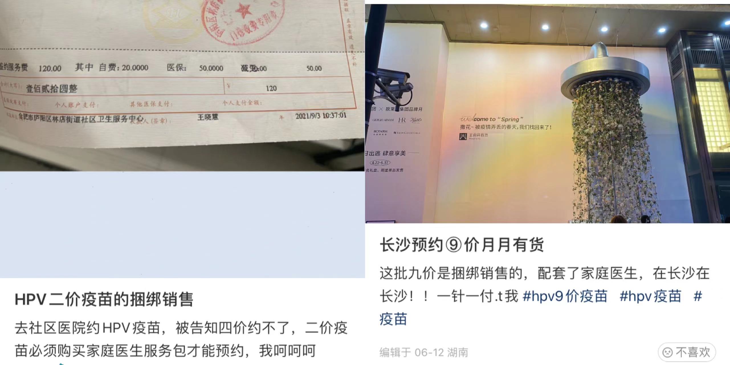 另有网友称,自己在合肥市庐阳区林店街道社区卫生服务中心被告知,购买2价HPV疫苗必须购买家庭医生签约服务包。依据图片信息,家庭医生签约服务包项目总费用120元,其中自费20元、医保50元、减免50元。而在湖南长沙,同样也有网友晒出了一样的“接种配套家庭医生服务项目”模式。