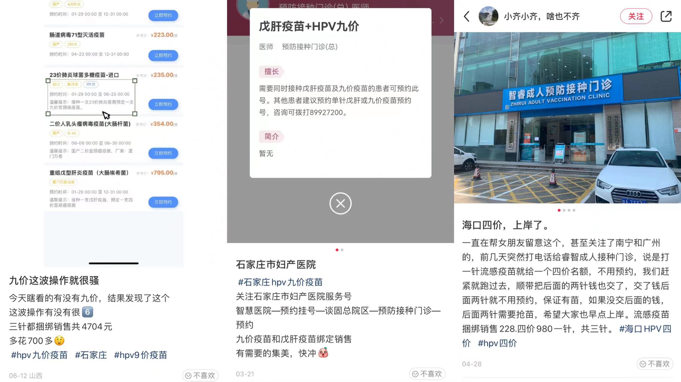 此外有网友反馈,在石家庄,有出现接种23价肺炎疫苗给予预定9价HPV疫苗的预约选项,或是接种一支戊型肝炎疫苗预定一支4价HPV疫苗。同样的,在石家庄妇产科医院也有9价HPV和戊肝疫苗一起预约的项目。此外,也有海口网友表示当地有打流感疫苗就给4价HPV疫苗预约资格的现象。
