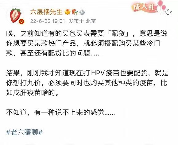 微博健康医疗大V“六层楼先生”6月22日发文称:“我才知道现在打HPV疫苗也要配货,就是你想打九价,必须要同时也购买其他种类的疫苗,比如戊肝疫苗啥的。”