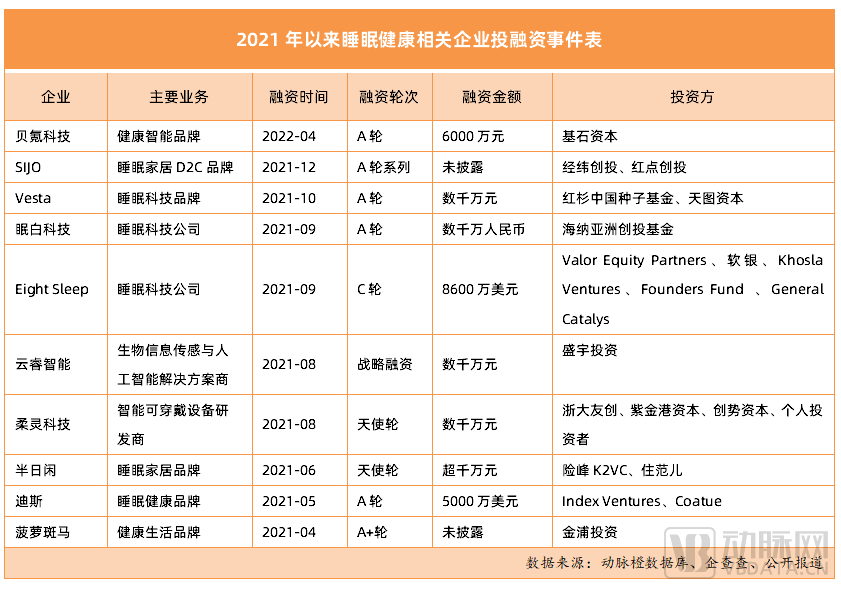 一级市场方面也热度不减。包括趣睡科技、菠萝斑马、TipsYou、sijo、Vesta、眠白科技、8h、Mooring等多家睡眠科技公司已完成融资,吸引了红杉、经纬、软银、红点、SIG等顶级投资机构入局。