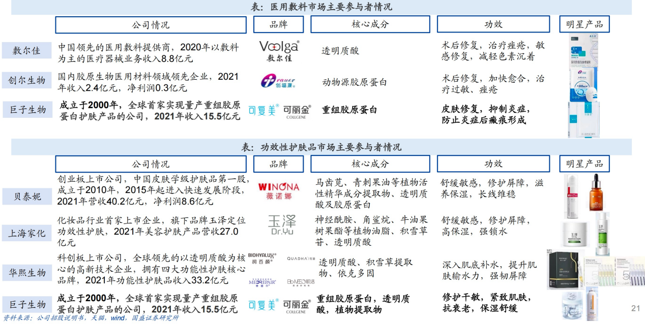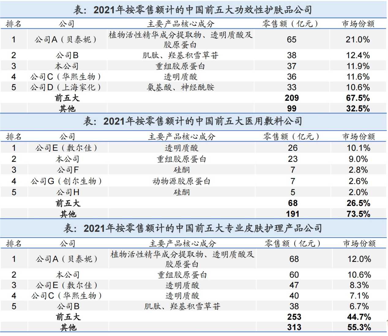 ③ 细分赛道靠前:胶原蛋白热门赛道排名TOP3,平均市占率10%。2021年在医用敷料、功效型护肤品和专业护肤品市场分别位列第2名、第3名、第2名,市占率9%/12%/11%。