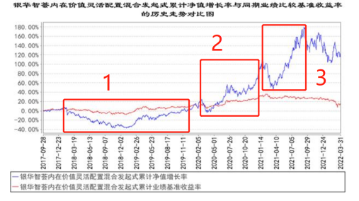 银华智荟内在价值灵活配置混合发起式成立于2017年9月28日,2018年、2019年、2020年、2021年、自基金合同生效起至今的净值增长率依次为-36.99%、63.29%、68.90%、40.09%、113.11% 。同期业绩比较基准收益率依次为-9.32%、20.09%、15.25%、-1.96%、14.31%。