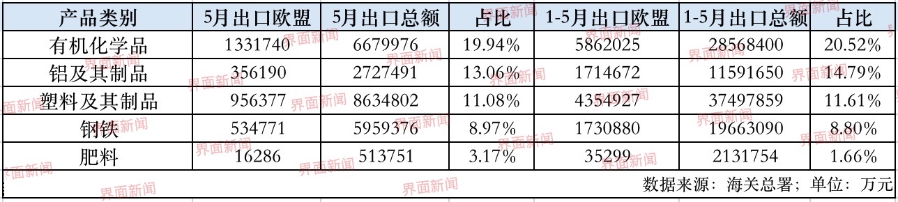 界面新闻查询的海关总署数据显示,今年1-5月,中国有机化学品出口至欧盟的金额为586.2亿元,约占总出口额的两成;铝、塑料及其制品出口至欧盟的比重分别约15%和12%;钢铁出口至欧盟的占比为8.8%;肥料出口欧盟的占比相对较少,约为1.66%。