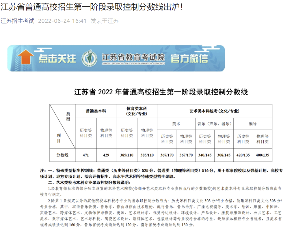 “江苏招生考试”微信公众号24日消息,江苏省普通高校招生第一阶段录取控制分数线出炉,本科历史等科目类471分,物理等科目类429分。