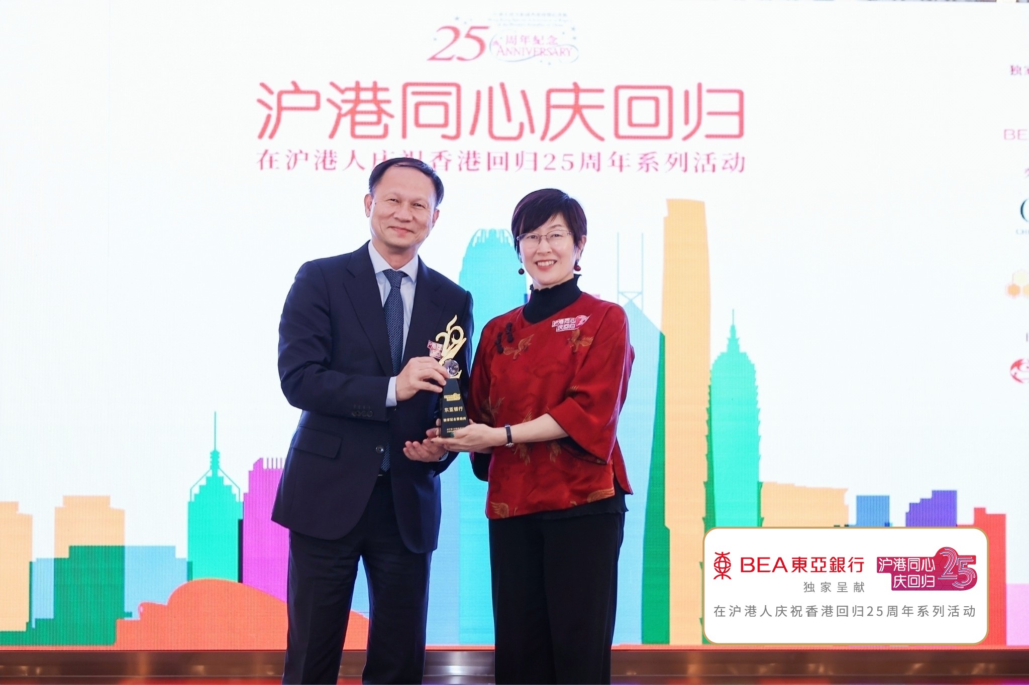 启动仪式上,香港特区政府驻上海经济贸易办事处主任蔡亮向东亚中国执行董事兼行长何舜华颁发了回归纪念礼,感谢东亚银行对于庆回归系列活动的大力支持。