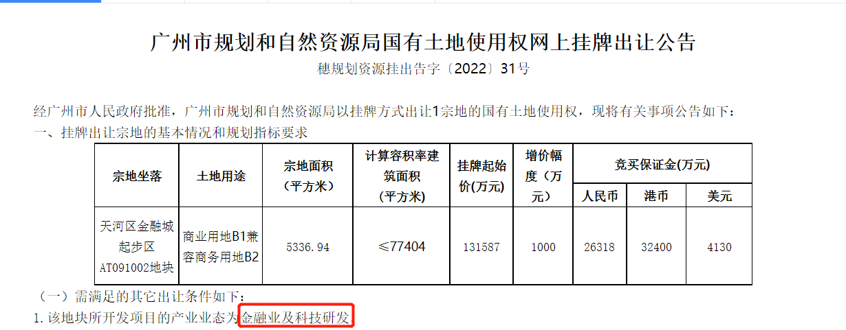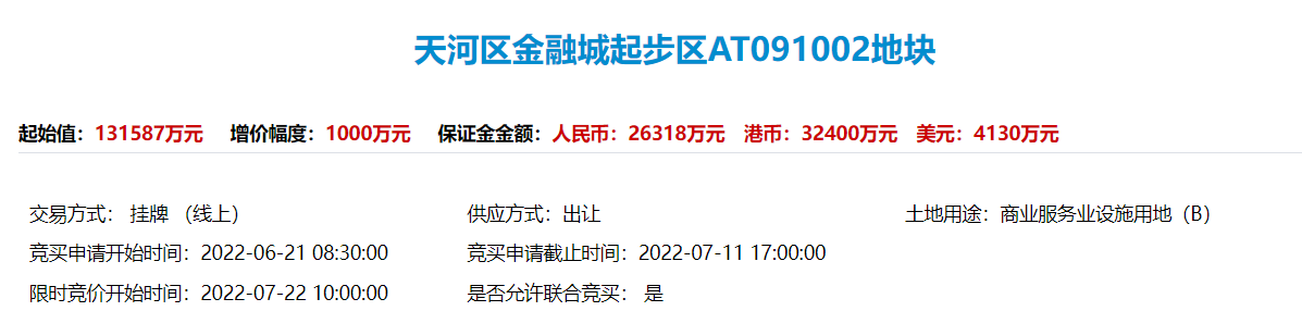 据了解,该地块为天河区金融城起步区AT091002地块,用途为商业用地B1兼容商务用地B2,出让年限为综合或者其他用地50年,商业、旅游、娱乐用地40年。计算容积率建筑面积≤77404㎡,增价幅度1000万元。