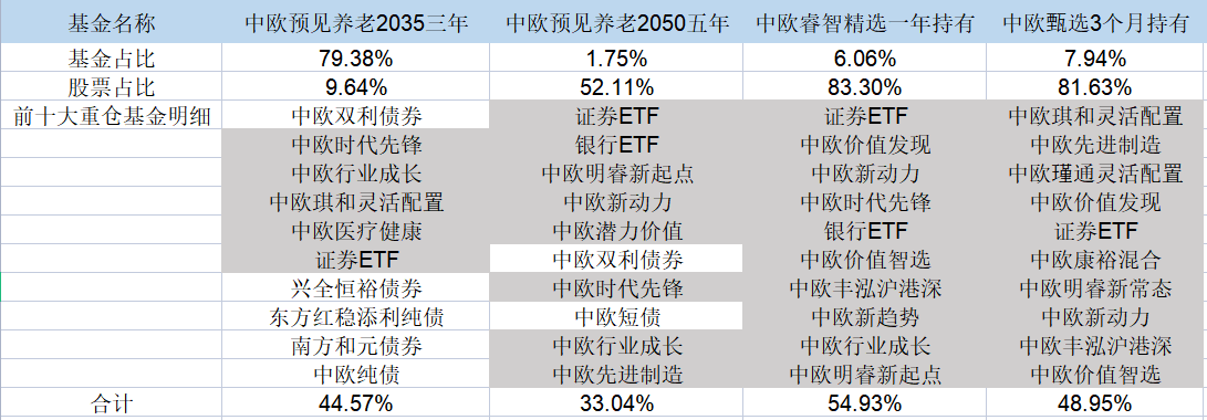 一季度报显示,中欧预见养老2035、中欧预见养老2050、中欧睿智精选、中欧甄选3个月四只基金中,重仓的主动权益类产品比重均较高。中欧睿智精选、中欧甄选3个月这两只FOF基金中,前十大重仓的基金均是主动权益类产品,占比分比为54.93%、48.95%。