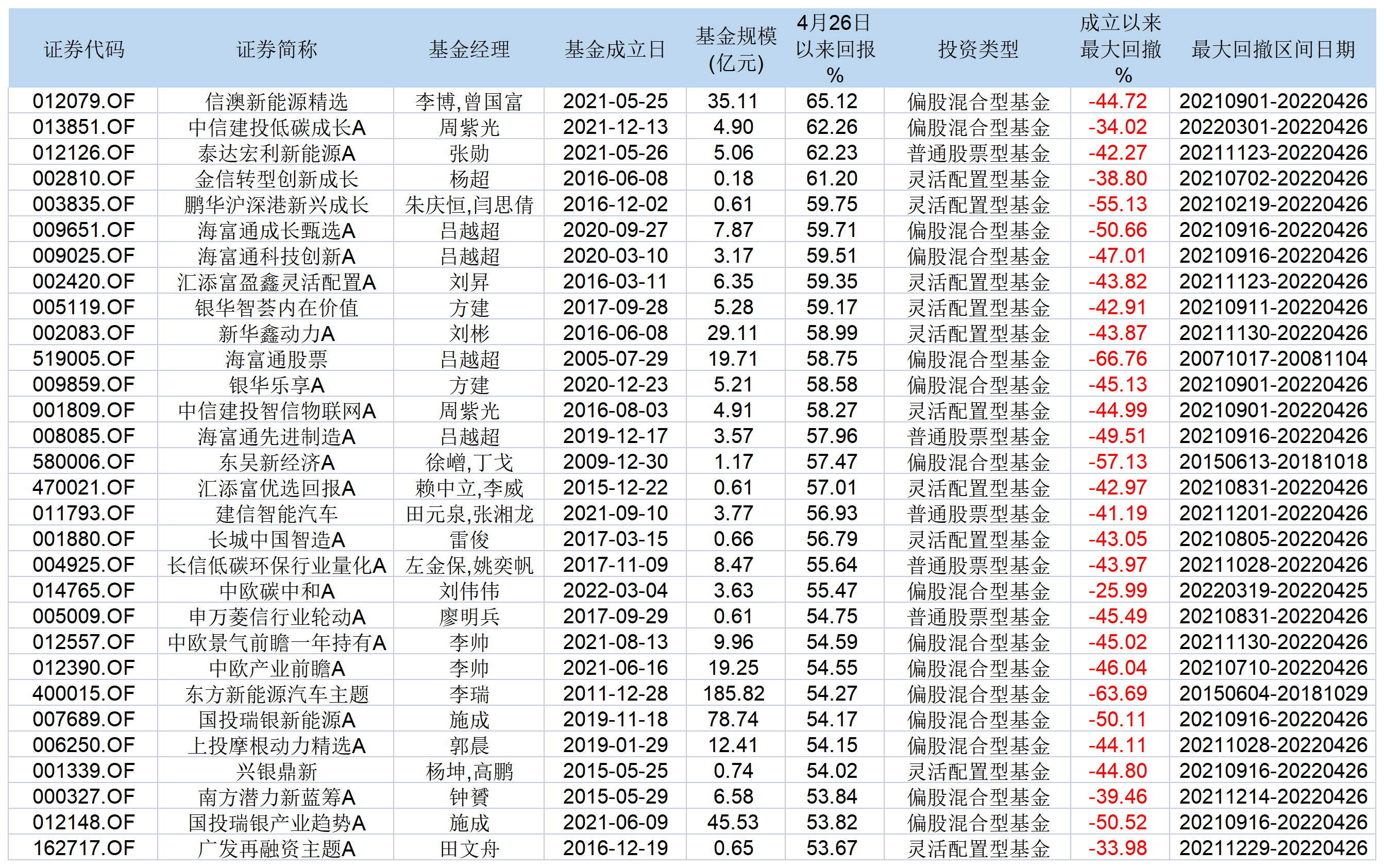 不过,值得注意的是,即使是取得了超50%的反弹,有些基金仍是刚从之前跌幅的深坑中爬出来。以海富通股票为例,自去年9月16日至4月26日,回撤达49.38%,在近两个月的反弹中,基金业绩为58.75%。东方新能源汽车主题,自去年9月16日至4月26日的区间回撤高达46.8%,近两个月业绩涨幅为54.27%。