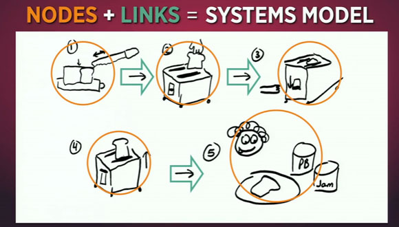 尽管这些图画有很多不同,但它们仍有一个共通的特质,就是大部分图形都有节点和连结。节点代表的是有形的物体,例如烤面包机和人,而连结则代表节点与节点之间的关系,结合连结和节点会产生一个完整的系统模型。它能展现出我们个人的心智模式,展现出我们对某些东西运作方法的理解,那就是这个构想的价值。“或许我们对于画图表不在行,但重点是我们会直觉地将复杂的事分解为简单的事,然后再合并一起。”