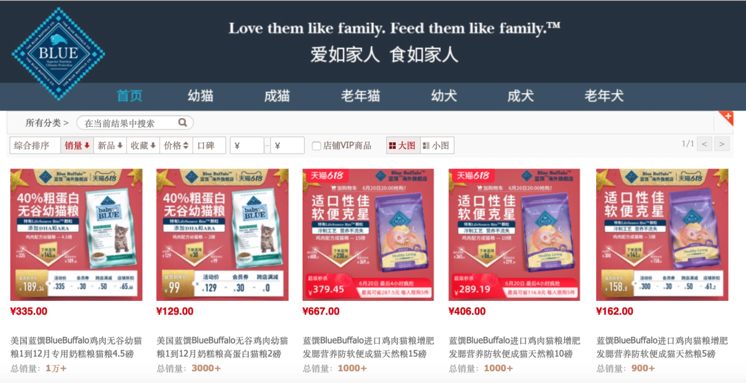 今天,小食代在Blue Buffalo天猫海外旗舰店上看到,该品牌目前已经引入了十多款进口产品,覆盖幼猫/犬、成猫/犬、老年猫/犬的口粮。有意思的是,店内销售前五都是猫粮。
