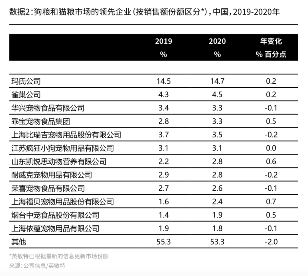 对于长年在中国卖冰淇淋和速冻食品的通用磨坊来说,要进攻宠物食品市场也并非易事,它将面临着一众劲敌。小食代翻阅的英敏特数据显示,2020年,按照以销售额份额计算的市场份额,中国狗粮和猫粮市场上的“三巨头”分别是玛氏(14.7%)、雀巢(4.5%)和华兴宠物食品(3.3%)。