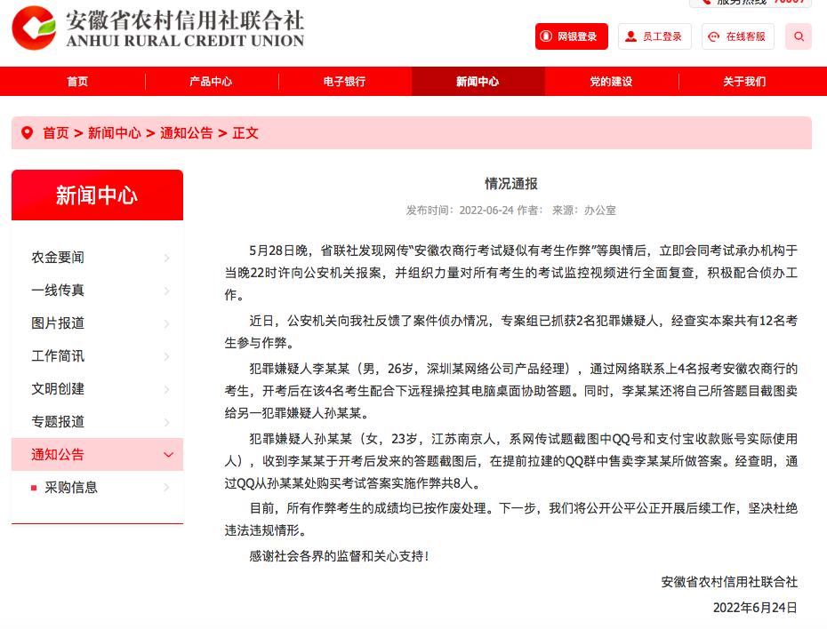 6月24日,安徽农信社在官网发布情况通报称,5月28日晚,省联社发现网传“安徽农商行考试疑似有考生作弊”等舆情后,立即会同考试承办机构于当晚22时许向公安机关报案,并组织力量对所有考生的考试监控视频进行全面复查,积极配合侦办工作。