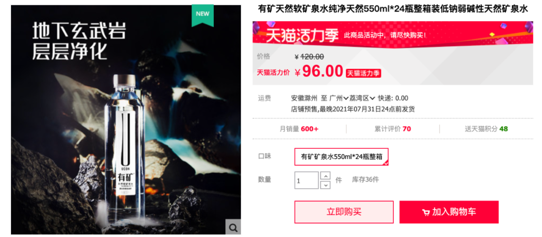 首先在产品营销方面,延续了细分品类故事化。在品牌故事中,该产品水源来自云南原始森林深层自涌泉,经地下深层玄武岩34年过滤,富含人体需要的钾、钙等微量矿物质元素,天然弱碱性,建议4℃饮用最佳。
