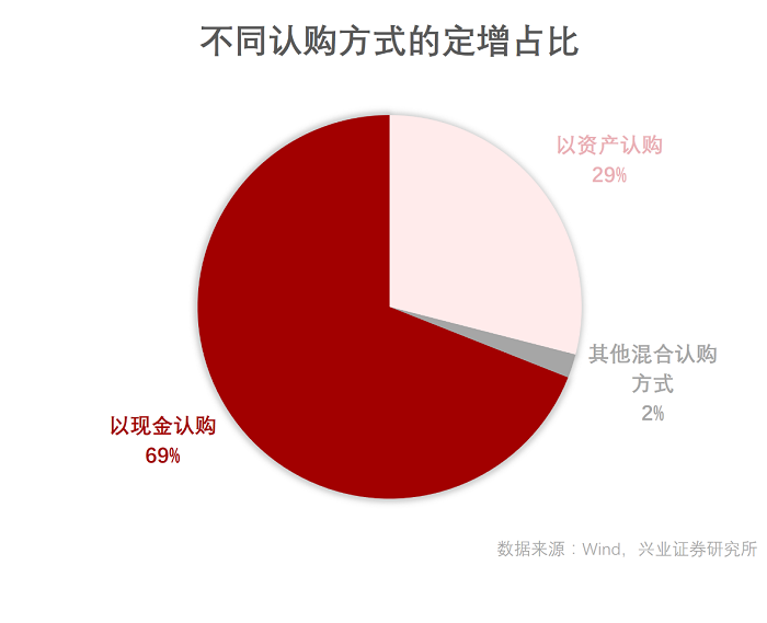 此外,在认购方式上,除去现金认购,定增的认购方式还包括资产、现今、债券以及混合认购方式。从统计数据来看,大部分定增都是以现今方式认购,占比将近70%。