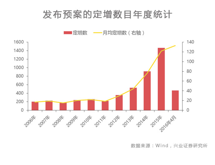 数据显示,2007年—2015年,定增平均收益率达50%,过去6年每年跑赢大盘,2015年定增基金平均收益率达133%。若进一步看2008年、2013年、2014年三个大盘低位时参与定增的收益率,则分别为166%、76%、53%,均超越定增历年平均收益水平(50%)。