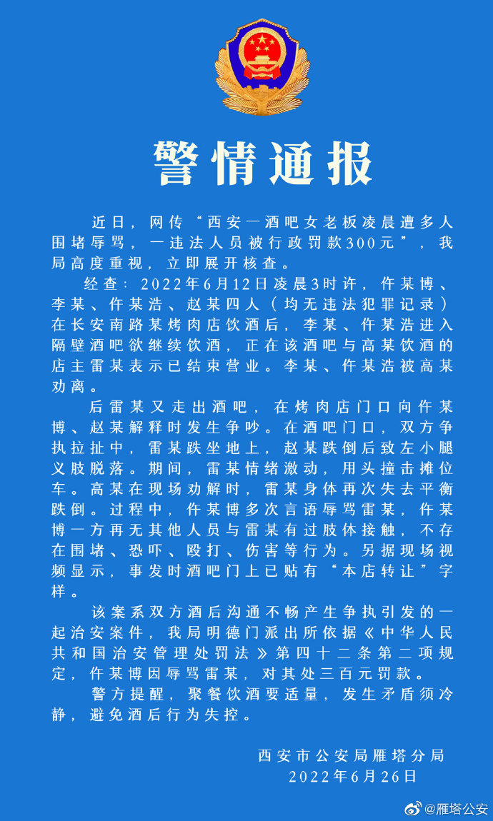 西安市公安局雁塔分局官方微博26日通报,近日,网传“西安一酒吧女老板凌晨遭多人围堵辱骂,一违法人员被行政罚款300元”,该局高度重视,立即展开核查。该案系双方酒后沟通不畅产生争执引发的一起治安案件。
