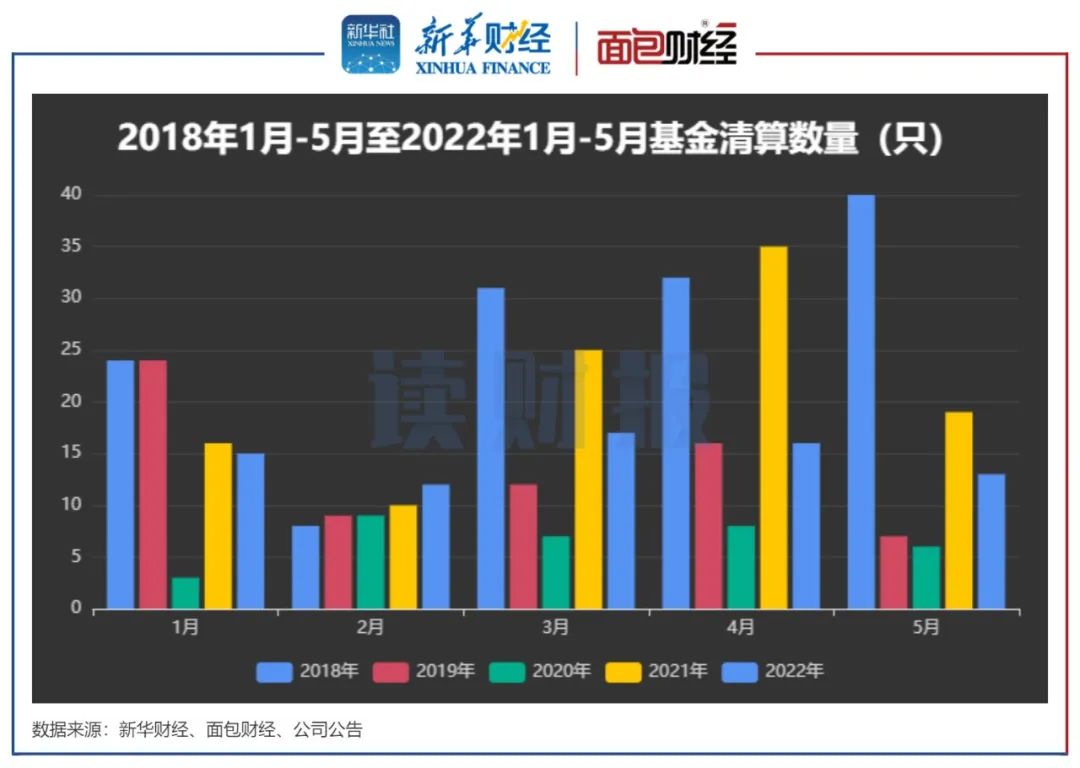 其中,2022年前5月的清盘数量为73只,低于2018年和2021年同期的清盘数量,但高于2019年和2020年同期的清盘数量。2022年前5月的清盘数量分布较为平均,各月均在10只到20只之间。