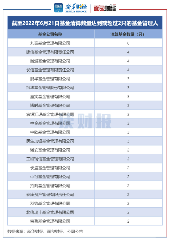 截至2022年6月21日,建信基金、融通基金、长信基金年内均有4只产品清算,数量仅次于九泰基金。