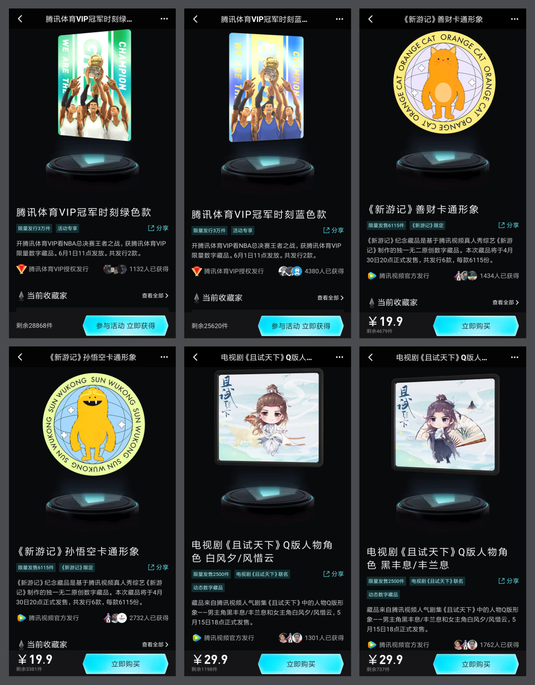 会员数量已稳坐爱优腾头把交椅的腾讯视频动作最为密集,近6个月来,几乎每月都发行一款数字藏品。最新推出的藏品是在6月初,腾讯体育VIP用户可领取一款限量6万份的《冠军时刻》数字藏品。