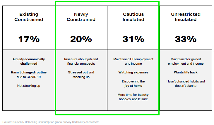 报告将消费者分为四类人群:已受限者,新受限者,谨慎者,无限制者(定义见下文)。这四类人群贡献的销售额分别为 17%,20%,31%,33%。