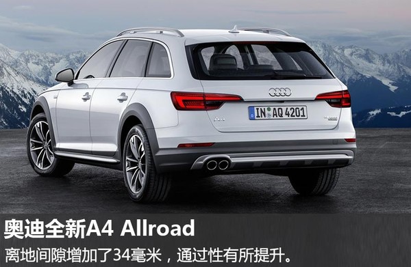 奥迪全新A4 Allroad采用了六边形中网和直瀑式镀铬装饰条,车底装有防擦护板,离地间隙增加了34毫米,通过性有所提升。新车的整体尺寸为4750*1842*1493毫米,全系标配全景天窗、真皮座椅、三温区空调、Pre Sense自动紧急制动系统等。