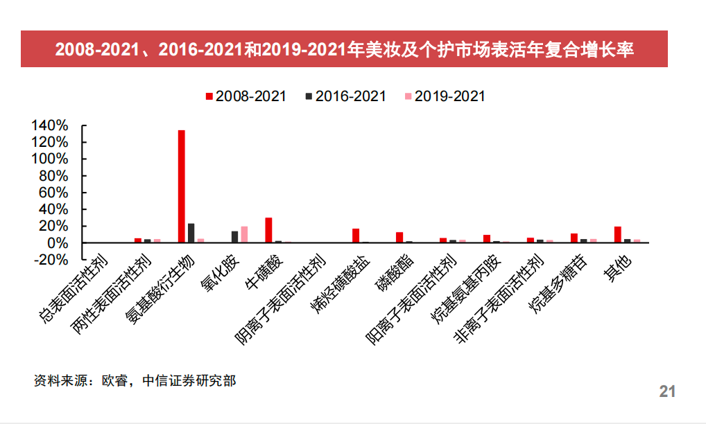 从数据可以看出,氨基酸衍生物的增速,一枝独秀。2008年到2021年,年复合增速达到了135%。