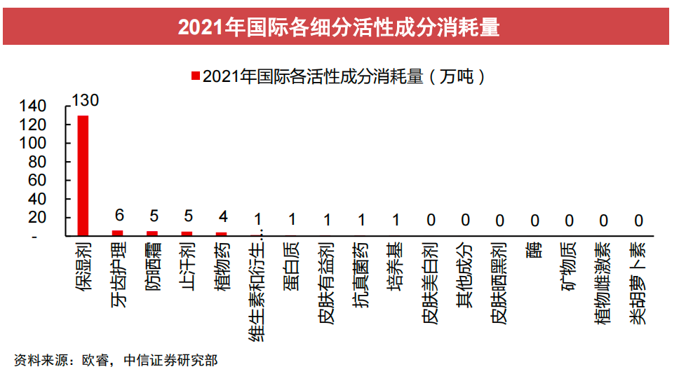 值得注意的是,在所有的活性成分中,保湿剂的消耗量是最大的。其次为防晒剂、牙齿护理剂、植物成分、止汗剂等。